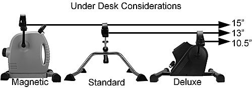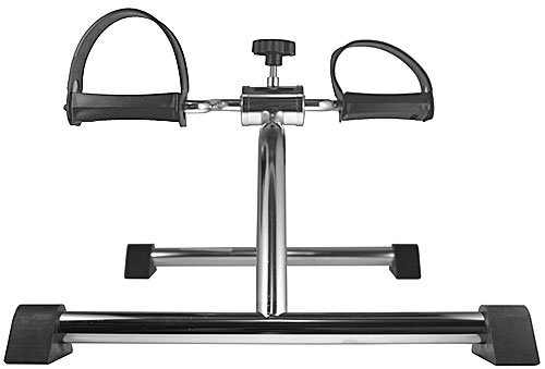 Under desk consideration: Standard Pedal Exerciser pedal height tops out at 13″. Isokinetics’ Deluxe Pedal Exerciser is best option for under desk use, with a pedal top out height of 10.5″. Direct from manufacturer pricing means you save more. 1 year warranty from Isokinetics Inc. Now comes with Dycem anti-slip strips to place under the feet to help solve a common problem of slipping on smooth floors. Made of high quality 1″ chrome-plated steel tubing, with 4 flat-bottom rubber feet to grip the floor, and adjustable pedal straps to keep your feet in place. Has solid construction, sturdy feet and an effective resistance range from light to noticeably stiff. Appropriate for elderly exercise as well as for a modest aerobic workout. Can be used for upper body exercises by placing it on a table and using your arms, or for lower body exercises placed on the floor and pedaled with your feet. At 5 pounds, it is easy to move around and store. Sit with legs at close to a 90 degree angle. Start your exercise program slowly and gradually work up to 20 minutes of exercise at least 3 times a week. Please note that like all pedal exercisers of this design, the resistance knob housing can become hot after using vigorously, so take care when touching after heavy use. We found it does not heat up much when used at lower resistance levels. ALWAYS consult a physician before beginning this, or any other, exercise program. For more rigorous needs, consider our Deluxe or Magnetic models.